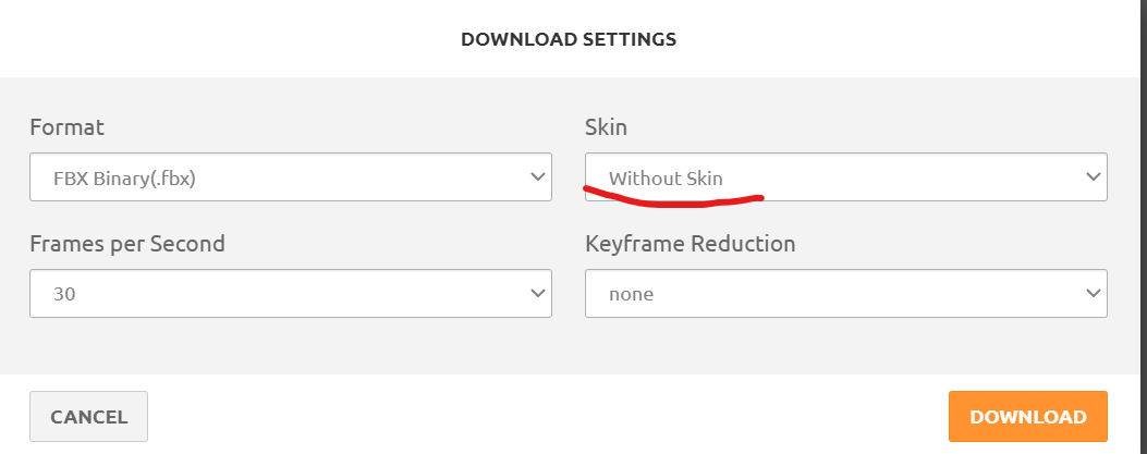 ダウンロード、このときwithout Skinでボーンのみダウンロードする